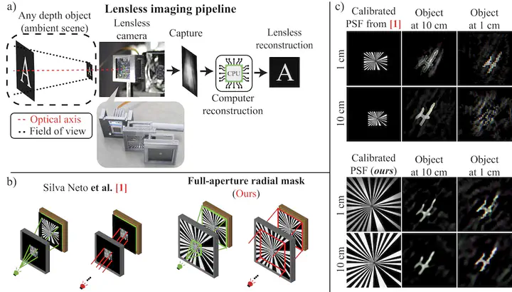 符号化開口と計算再構成を組み合わせたレンズレスイメージングは、極めて薄型なカメラ実現に向けた有望な技術として注目されています。私たちはこれまでに、開口パターンを放射状に設計することで被写界深度を大きく拡張できることを示してきました[1]。しかし、再構成の安定性を確保するためには開口領域を制限する必要があり、それが被写界深度の伸長におけるボトルネックとなっていました。本研究では、開放型の放射状開口(full-aperture radial mask)を採用した新しいレンズレス光学系と、その特性に最適化した画像再構成アルゴリズムを開発することで、この課題を克服しました。その結果、より「全焦点」に近い撮像を小型光学系・処理系で実現できるようになりました。数値実験および実機プロトタイプにより、近距離から遠距離までの被写体を同時に鮮明に捉える超薄型カメラの可能性を実証するとともに、文字認識、QRコード読み取り、自然物体撮像など、多様な応用への有効性を確認しました。